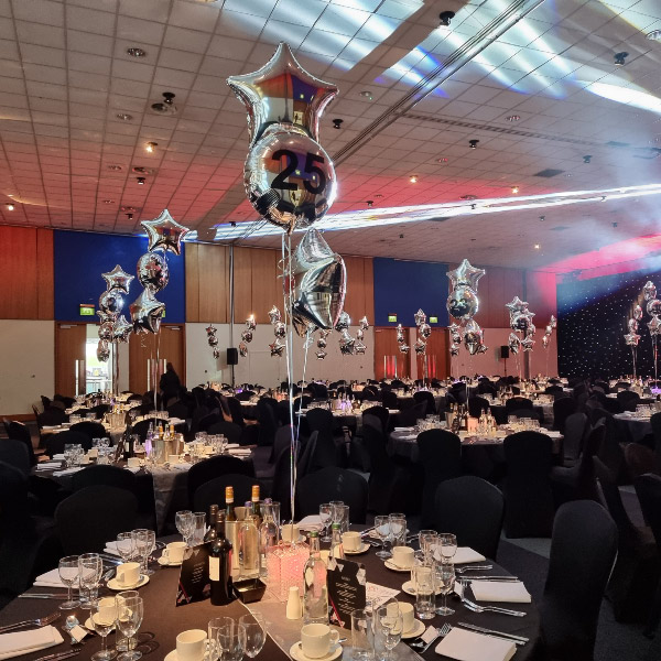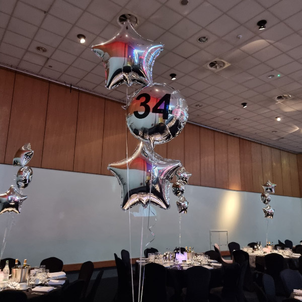 The 18” silver round foil balloons are printed with a large black number on each side of the balloon. We then add two additional balloons, one above and one below to make a set of three.These extra balloons are available in many colours as well as in round, star or heart-shaped so if you have a colour scheme then we can try and match this for you. We can also add the table number balloons to the top of sets of latex balloons.