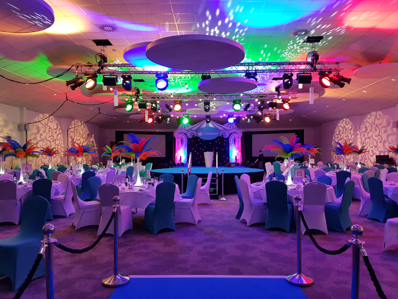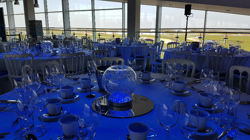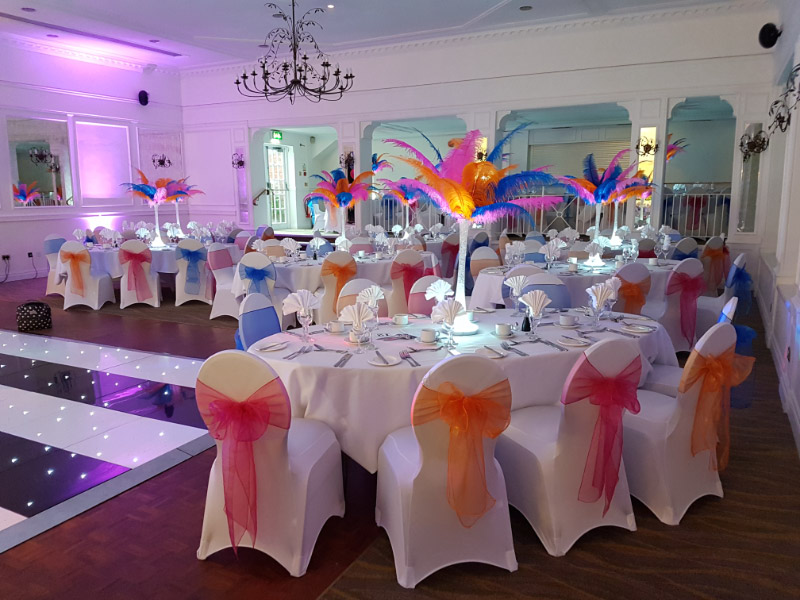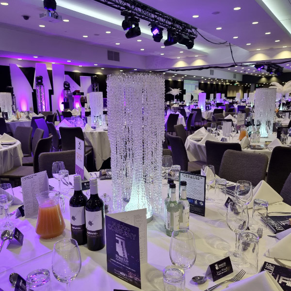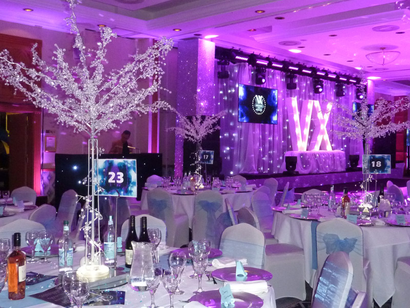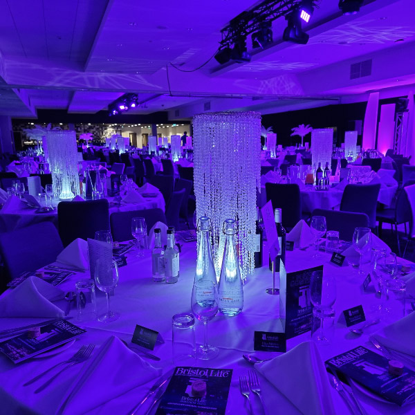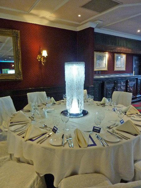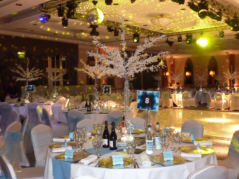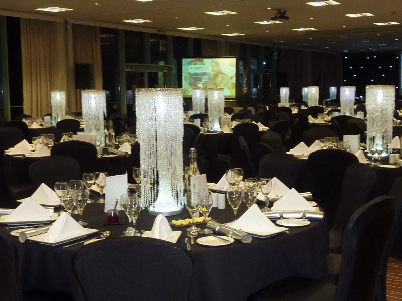 Choose from a range of tall centrepieces such as our crystal trees with uplighting, ostrich feather displays in lily vases or martini vases, mirrorball centrepieces, crystal table chandeliers and crystal candleabras. If you are looking for a lower table centrepiece then choose from our bubble bowls filled with silver wire balls which can then be illuminated in many different colours, crystal balls, moon balls, crystal cones and our star lamps.