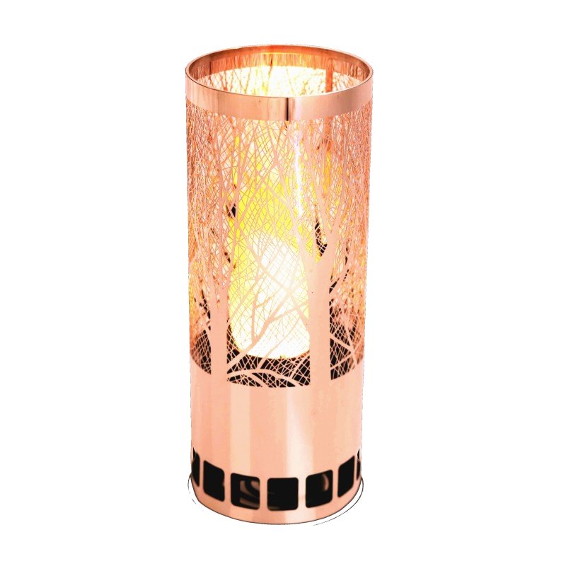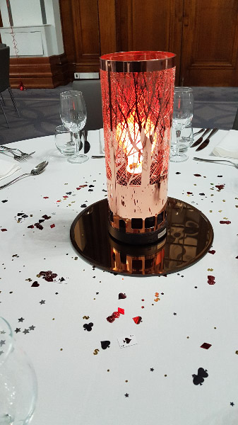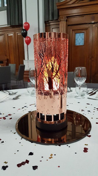 Now available - New table centrepiece flame lamps with real silk flickering flame that looks good enough to be real within a copper forest design lamp. See gallery for photo or call us for more information.